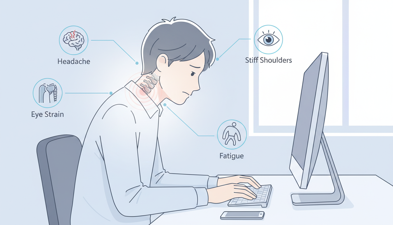 このような症状は一つだけ出る場合もあれば、いくつかが重なって出ることもあります。パソコン作業が続くと肩や首がガチガチになる、週末になると頭痛が出るといった形で、自分なりのパターンを感じている方も多いです。